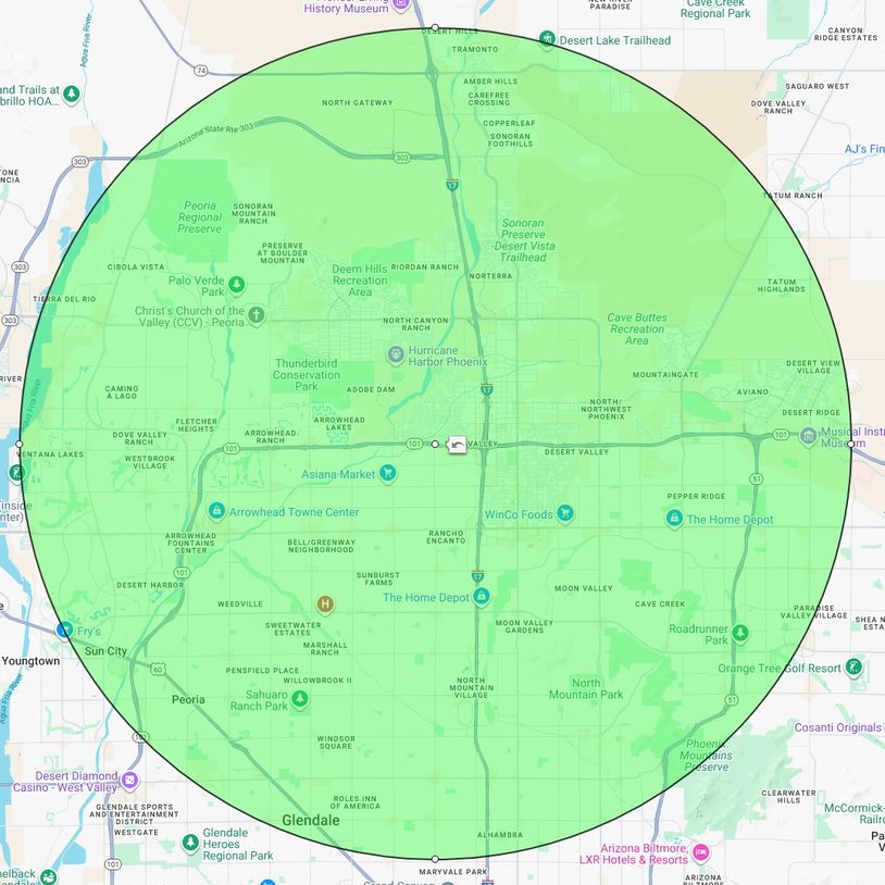 Serving clients within 10 miles of 35th Ave and the 101 in Glendale, AZ. We add an additional $10 charge for each mile we must travel outside of the 10-mile boundary.